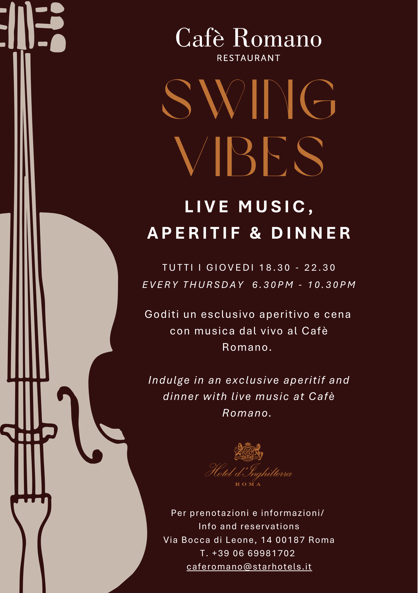 Every Thursday evening, from 6:30 pm to 10:00 pm, Café Romano hosts Swing Vibes, an event that sets the tone for aperitif and dinner with the timeless sounds of a live jazz trio. Smooth swing melodies provide the soundtrack to an evening celebrating taste and conviviality, featuring signature cocktails crafted by Bar Manager Angelo Di Giorgi and zero-kilometre specialties by Executive Chef Andrea Sanguiliano. An experience to be savoured at a relaxed pace, in the heart of Rome, where music, cuisine and atmosphere come together in perfect harmony.