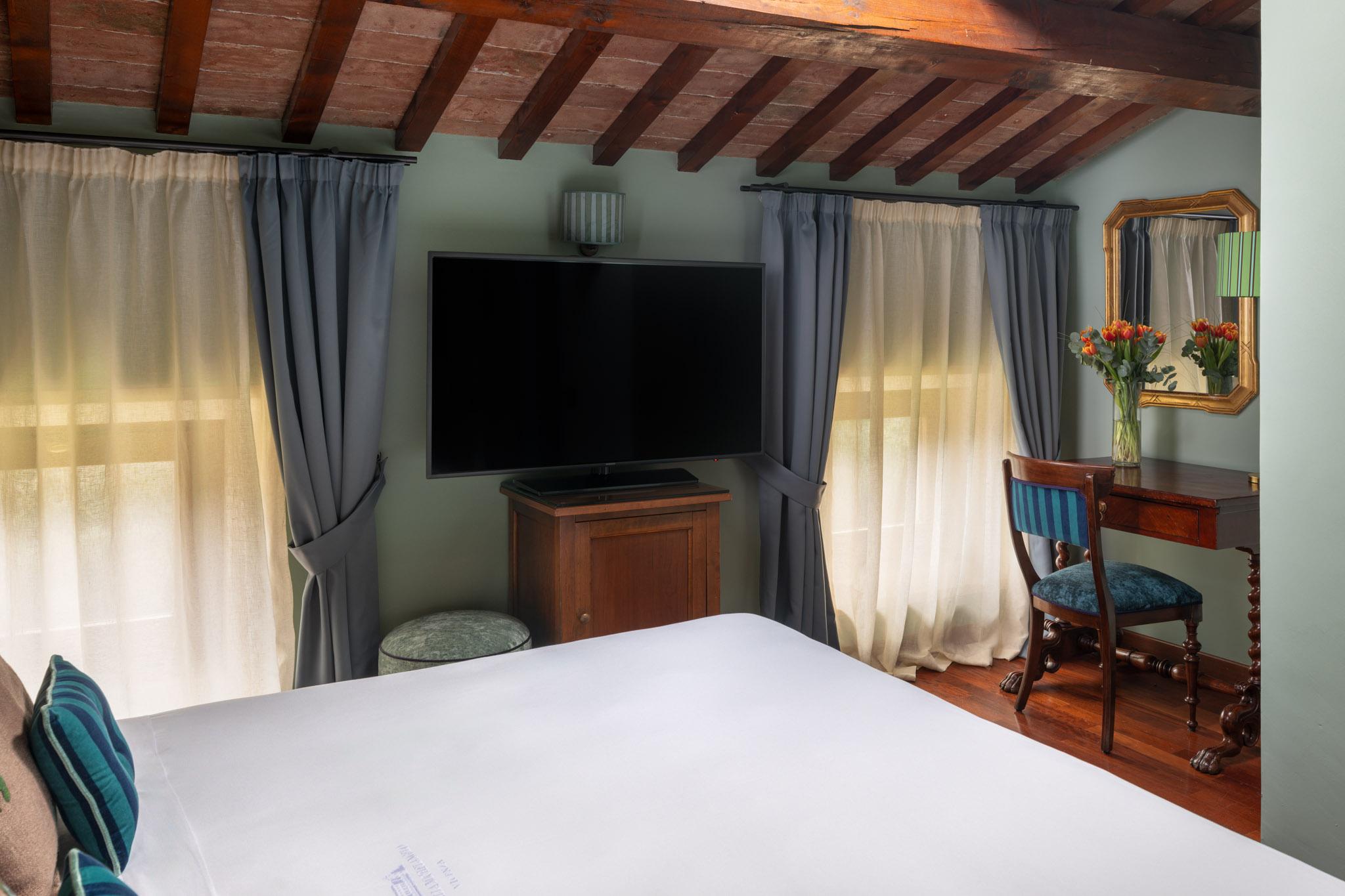 Here the wood-beamed ceiling, fine carpets, exquisite interior design and layout and the views of the lovely garden below will help you recover your balance and calm your mind. The soft light that enters from the Windows also plays a role in the interior design, giving it a different ambience depending on the time of day.